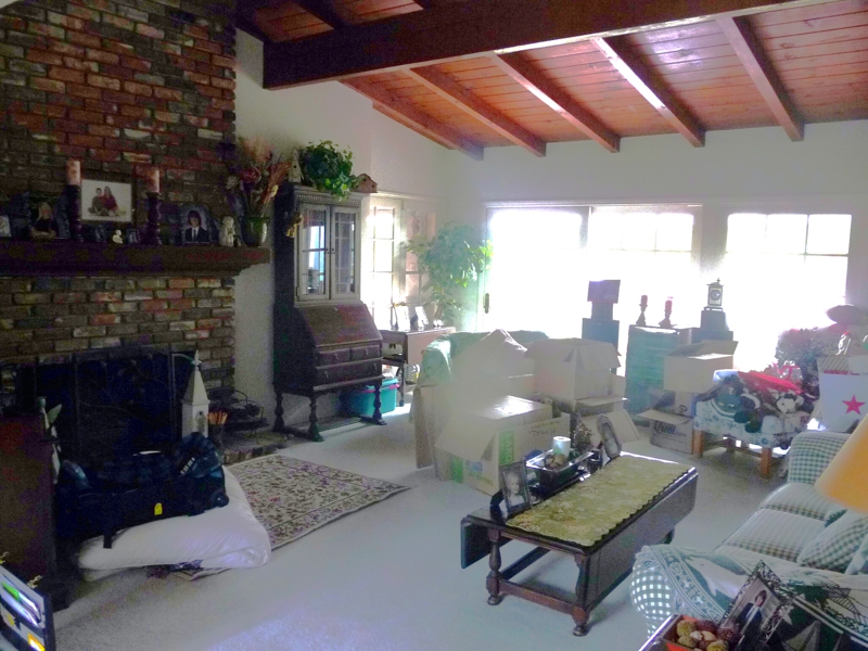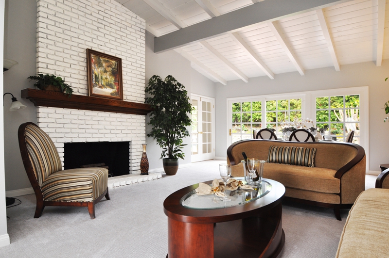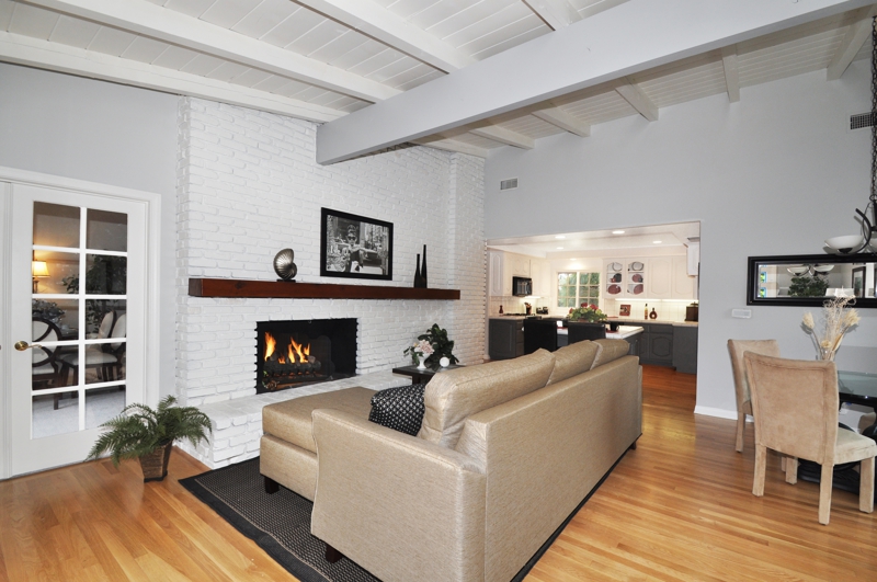 Family room before with natural brick Family room after painting fire place, beam and ceiling