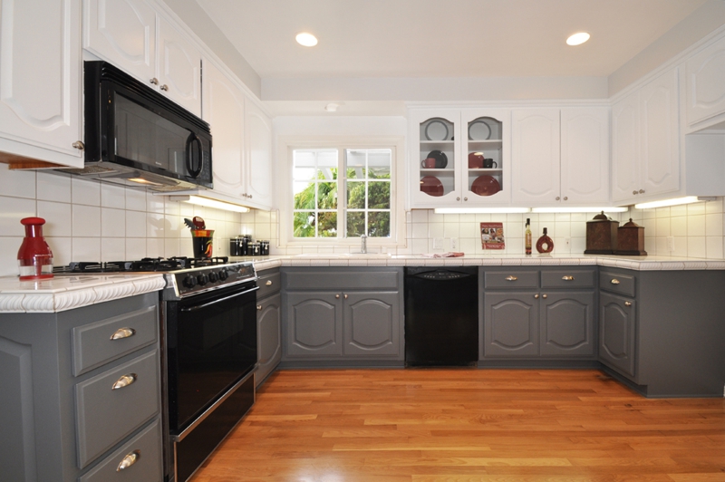 Kitchen before with outdated oak cabinets Kitchen after with painted cabinets, new hardware, refinished floor